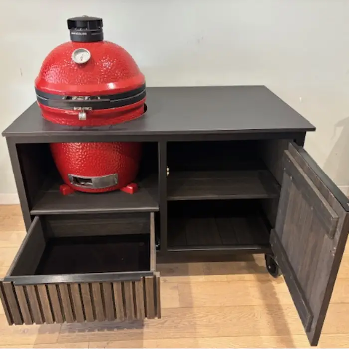 The outdoor kitchen is made of a strong steel frame with a durable powder-coated finish. The bamboo wood is a fast-growing, sturdy wood that can withstand moisture well. The Rhombus profile gives the table a luxurious look. The Dekton worktop offers plenty of space for cutting, preparing and cooking. Behind the cabinet door is handy storage space for accessories and charcoal. The table has been used and has obvious damage in a few spots. These are visible in the photos.